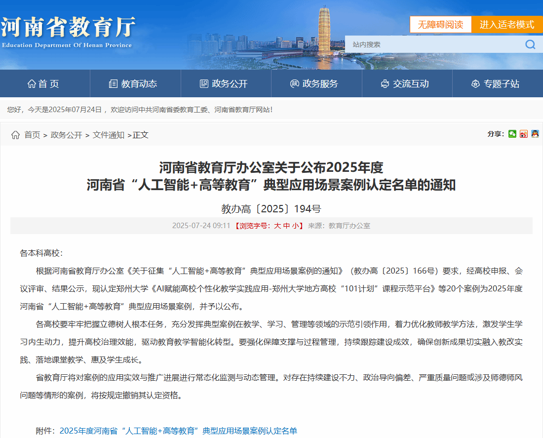 7月24日,河南省教育厅正式公布了2025年度“人工智能+高等教育”典型应用场景案例认定名单,由我部申报的郑师“师问”AI智能体凭借创新性技术架构与显著应用成效成功入选!