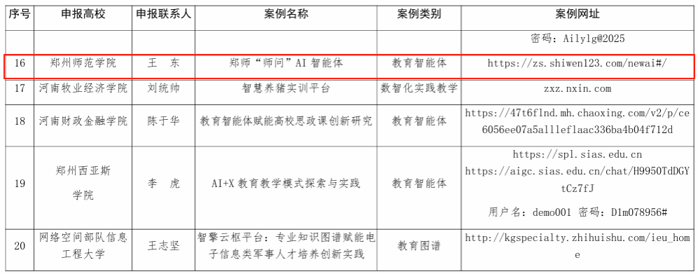 此次案例征集活动由河南省教育厅在全省范围内组织,旨在落实《河南省“人工智能+教育”三年行动计划(2025—2027年)》,共遴选了20个成效显著、可复制推广的人工智能教育应用标杆案例。经过严格评审,郑师“师问”AI智能体成功入选河南省“人工智能+高等教育”典型应用场景案例。